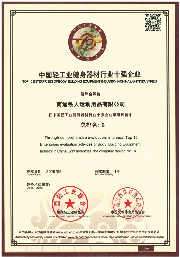| 2019 | 2019中國(guó)輕工業(yè)健身器材行業(yè)十強(qiáng)企業(yè) | 中國(guó)輕工業(yè)聯(lián)合會(huì)、中國(guó)文教體育用品協(xié)會(huì) |